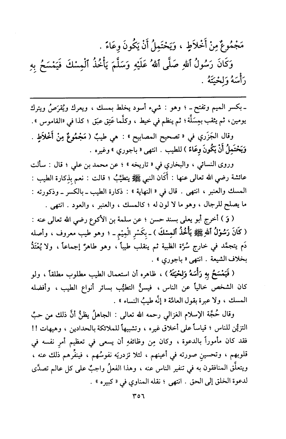 وكان رسول الله صلّى الله عليه وسلّم يأخذ المسك فيمسح به رأسه ولحيته.