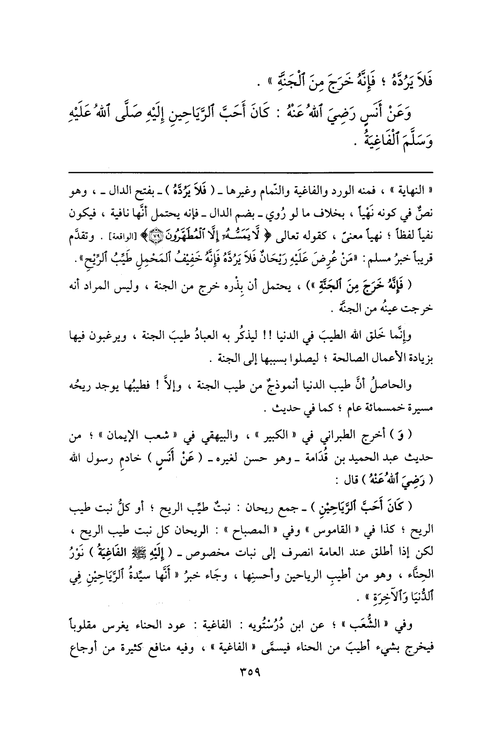 «النهاية» ، فمنه الورد والفاغية والنّمام وغيرها- (فلا يردّه) - بفتح الدال-، وهو نصّ في كونه نهيا، بخلاف ما لو روي- بضم الدال- فإنه يحتمل أنّها نافية، فيكون نفيا لفظا؛ نهيا معنى، كقوله تعالى (لا يَمَسُّهُ إِلَّا الْمُطَهَّرُونَ) (79) [الواقعة] . وتقدّم قريبا خبر مسلم: «من عرض عليه ريحان فلا يردّه فإنّه خفيف المحمل طيّب الرّيح» .