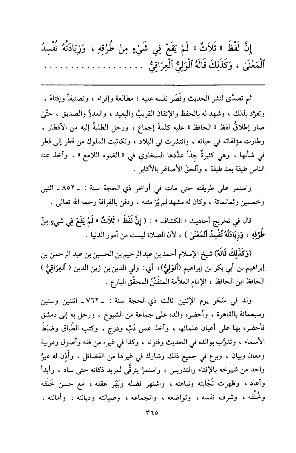 إنّ لفظ «ثلاث» لم يقع في شيء من طرقه، وزيادته تفسد المعنى، وكذلك قاله الوليّ العراقيّ ...