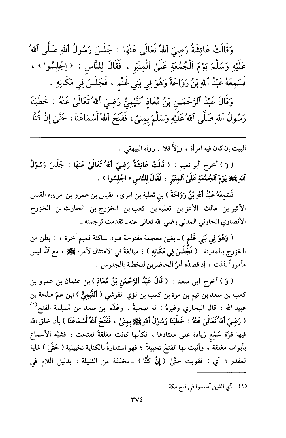 (و) أخرج ابن سعد: (قال عبد الرّحمن بن معاذ) بن عثمان بن عمرو بن كعب بن سعد بن تيم بن مرة بن كعب بن لؤي القرشي (التّيميّ) ابن عمّ طلحة بن عبيد الله، قال البخاري وغيره: له صحبة. وعدّه ابن سعد من مسلمة الفتح «1» (رضي الله تعالى عنه: خطبنا رسول الله صلّى الله عليه وسلم بمنى، ففتح الله أسماعنا) بأن خلق الله فيها قوّة سمع زيادة على معتادها، فكأنها كانت مغلقة ففتحت؛ فشبّه الأسماع بأبواب مغلقة، وأثبت لها الفتح تخييلا؛ فهو استعارة بالكناية تخييلية (حتّى) غاية لمقدر؛ أي: فقويت حتّى (إن كنّا) - مخففة من الثقيلة، بدليل اللام في