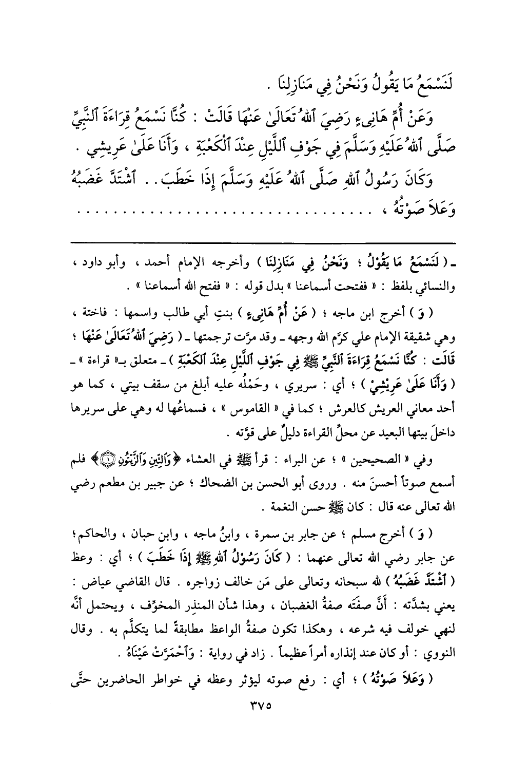 (و) أخرج ابن ماجه؛ (عن أمّ هانىء) بنت أبي طالب واسمها: فاختة، وهي شقيقة الإمام علي كرّم الله وجهه- وقد مرّت ترجمتها- (رضي الله تعالى عنها؛ قالت: كنّا نسمع قراءة النّبيّ صلّى الله عليه وسلم في جوف اللّيل عند الكعبة) - متعلق ب «قراءة» - (وأنا على عريشي) ؛ أي: سريري، وحمله عليه أبلغ من سقف بيتي، كما هو أحد معاني العريش كالعرش؛ كما في «القاموس» ، فسماعها له وهي على سريرها داخل بيتها البعيد عن محلّ القراءة دليل على قوّته.