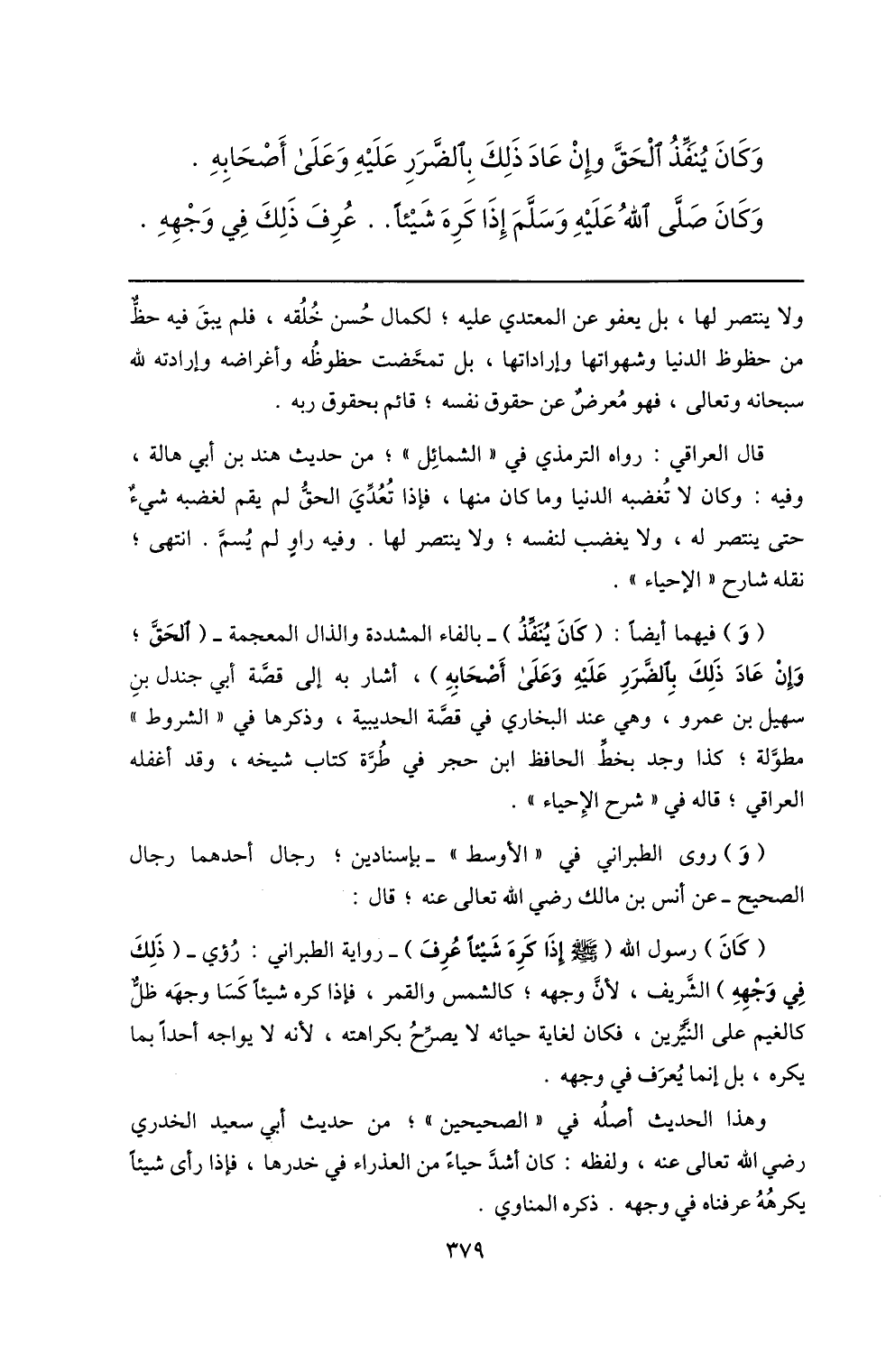 (و) فيهما أيضا: (كان ينفّذ) - بالفاء المشددة والذال المعجمة- (الحقّ؛ وإن عاد ذلك بالضّرر عليه وعلى أصحابه) ، أشار به إلى قصّة أبي جندل بن سهيل بن عمرو، وهي عند البخاري في قصّة الحديبية، وذكرها في «الشروط» مطوّلة؛ كذا وجد بخطّ الحافظ ابن حجر في طرّة كتاب شيخه، وقد أغفله العراقي؛ قاله في «شرح الإحياء» .