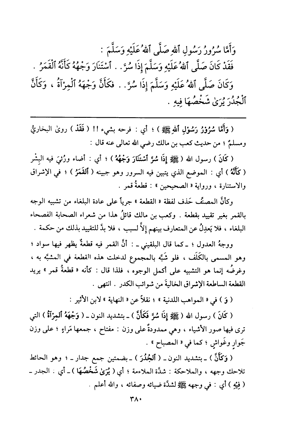 وكأنّ المصنّف حذف لفظة «القطعة» جريا على عادة البلغاء من تشبيه الوجه بالقمر بغير تقييد بقطعة. وكعب بن مالك قائل هذا من شعراء الصحابة الفصحاء البلغاء، فلا يعدل عن المتعارف بينهم إلّا لسبب، فلا بدّ للتقييد بذلك من حكمة.