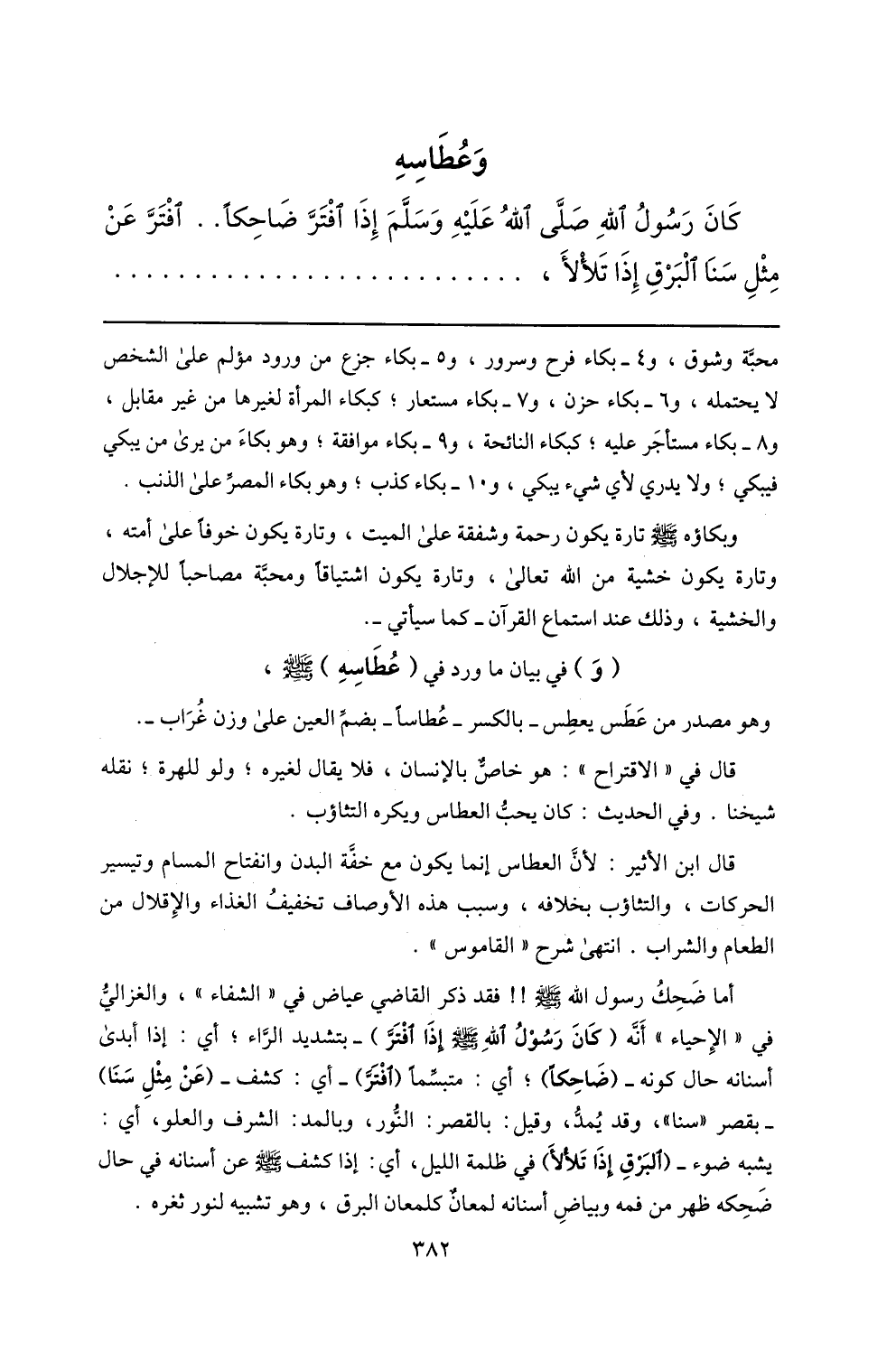 وعطاسه كان رسول الله صلّى الله عليه وسلّم إذا افترّ ضاحكا.. افترّ عن مثل سنا البرق إذا تلألأ، ...