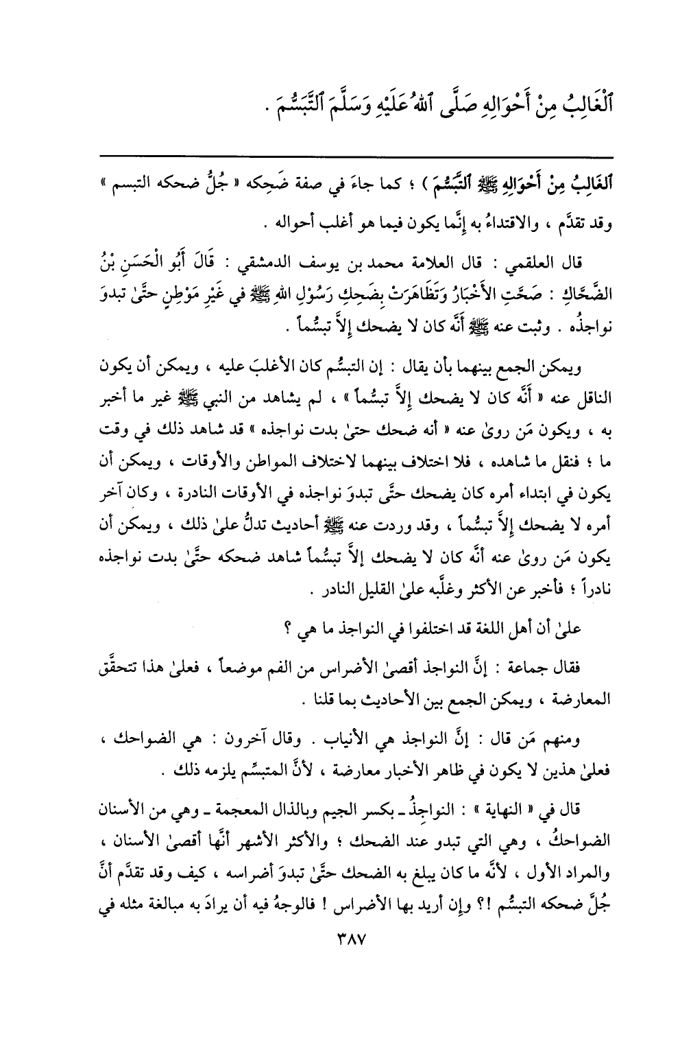 قال العلقمي: قال العلامة محمد بن يوسف الدمشقي: قال أبو الحسن بن الضّحّاك: صحّت الأخبار وتظاهرت بضحك رسول الله صلّى الله عليه وسلم في غير موطن حتّى تبدو نواجذه. وثبت عنه صلّى الله عليه وسلم أنّه كان لا يضحك إلّا تبسّما.