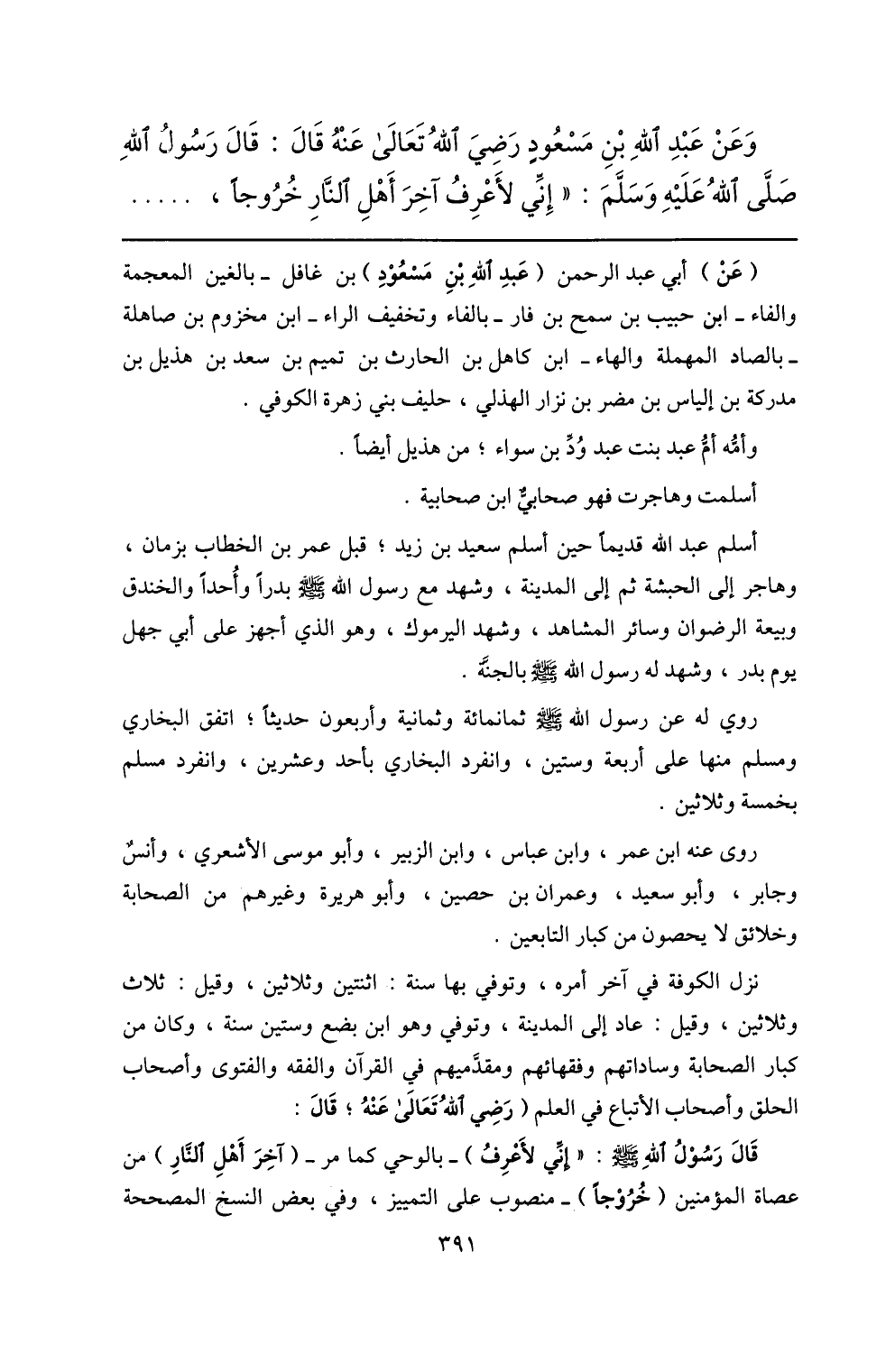 وعن عبد الله بن مسعود رضي الله تعالى عنه قال: قال رسول الله صلّى الله عليه وسلّم: «إنّي لأعرف آخر أهل النّار خروجا، ...