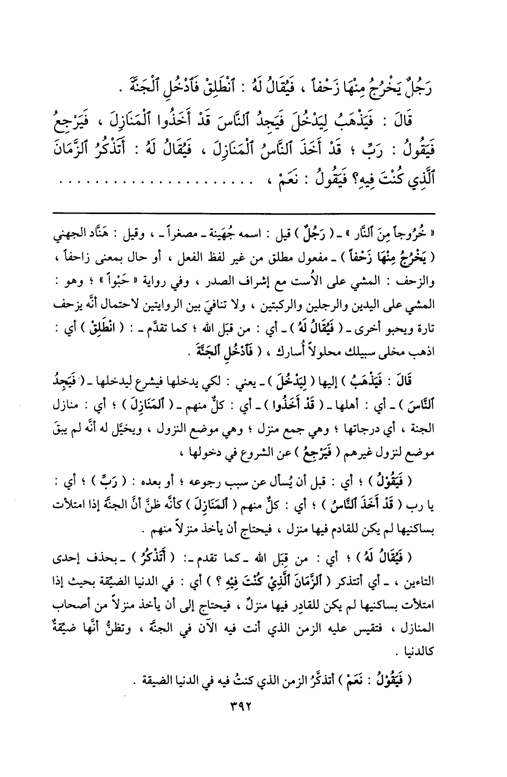 «خروجا من النّار» - (رجل) قيل: اسمه جهينة- مصغرا-، وقيل: هنّاد الجهني (يخرج منها زحفا) - مفعول مطلق من غير لفظ الفعل، أو حال بمعنى زاحفا، والزحف: المشي على الاست مع إشراف الصدر، وفي رواية «حبوا» ؛ وهو: