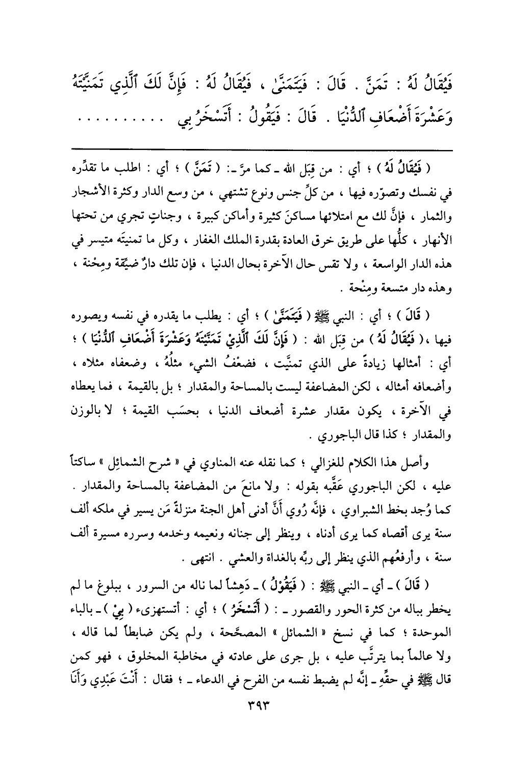 فيقال له: تمنّ. قال: فيتمنّى، فيقال له: فإنّ لك الّذي تمنّيته وعشرة أضعاف الدّنيا. قال: فيقول: أتسخر بي ...