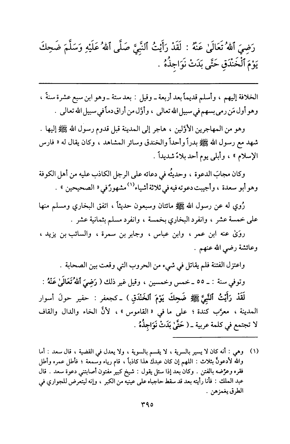 (1) وهي: أنه كان لا يسير بالسرية، لا يقسم بالسوية، ولا يعدل في القضية، قال سعد: أما والله لأدعونّ بثلاث: اللهم إن كان عبدك هذا كاذبا، قام رياء وسمعة؛ فأطل عمره وأطل فقره وعرّضه بالفتن. وكان بعد إذا سئل يقول: شيخ كبير مفتون أصابتني دعوة سعد. قال عبد الملك: فأنا رأيته بعد قد سقط حاجباه على عينيه من الكبر، وإنه ليتعرض للجواري في الطرق يغمزهن.