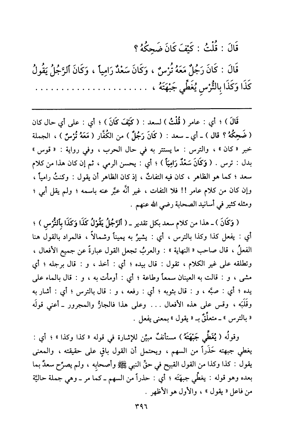 قال) ؛ أي: عامر (قلت) لسعد: (كيف كان) ؛ أي: على أي حال كان (ضحكه؟ قال) - أي- سعد: (كان رجل) من الكفّار (معه ترس) ، الجملة خبر «كان» ، والترس: ما يستتر به في حال الحرب، وفي رواية: «قوس» بدل: ترس. (وكان سعد راميا) ؛ أي: يحسن الرمي، ثم إن كان هذا من كلام سعد؛ كما هو الظاهر، كان فيه التفات، إذ كان الظاهر أن يقول: وكنت راميا، وإن كان من كلام عامر!! فلا التفات، غير أنّه عبّر عنه باسمه؛ ولم يقل أبي؛ ومثله كثير في أسانيد الصحابة رضي الله عنهم.