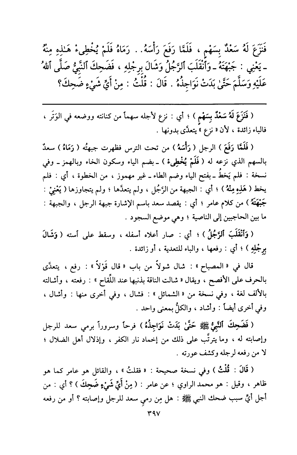 فنزع له سعد بسهم، فلمّا رفع رأسه.. رماه فلم يخطىء هذه منه يعني: جبهته- وانقلب الرّجل وشال برجله، فضحك النّبيّ صلّى الله عليه وسلّم حتّى بدت نواجذه. قال: قلت: من أيّ شيء ضحك؟