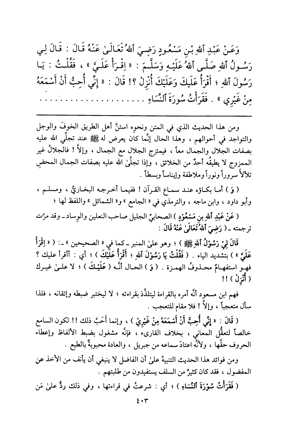 وعن عبد الله بن مسعود رضي الله تعالى عنه قال: قال لي رسول الله صلّى الله عليه وسلّم: «اقرأ عليّ» ، فقلت: يا رسول الله؛ أقرأ عليك وعليك أنزل؟! قال: «إنّي أحبّ أن أسمعه من غيري» . فقرأت سورة النّساء ...