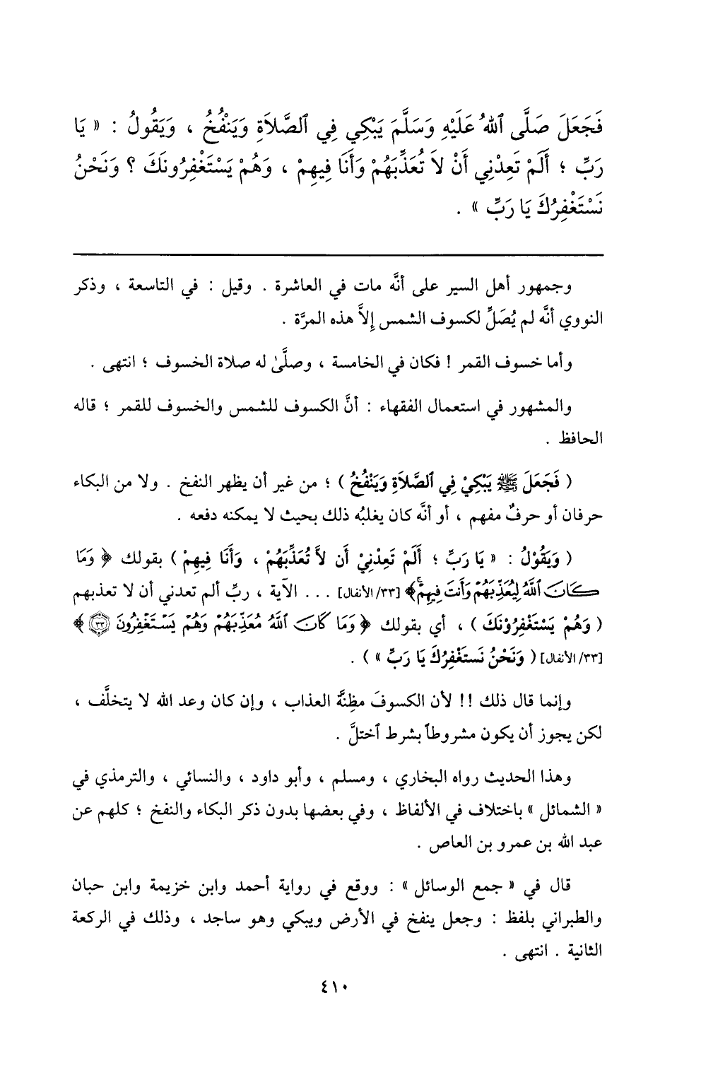 قال في «جمع الوسائل» : ووقع في رواية أحمد وابن خزيمة وابن حبان والطبراني بلفظ: وجعل ينفخ في الأرض ويبكي وهو ساجد، وذلك في الركعة الثانية. انتهى.