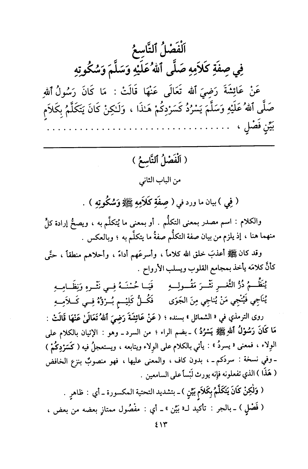 الفصل التّاسع في صفة كلامه صلّى الله عليه وسلّم وسكوته عن عائشة رضي الله تعالى عنها قالت: ما كان رسول الله صلّى الله عليه وسلّم يسرد كسردكم هذا، ولكن كان يتكلّم بكلام بيّن فصل، ...