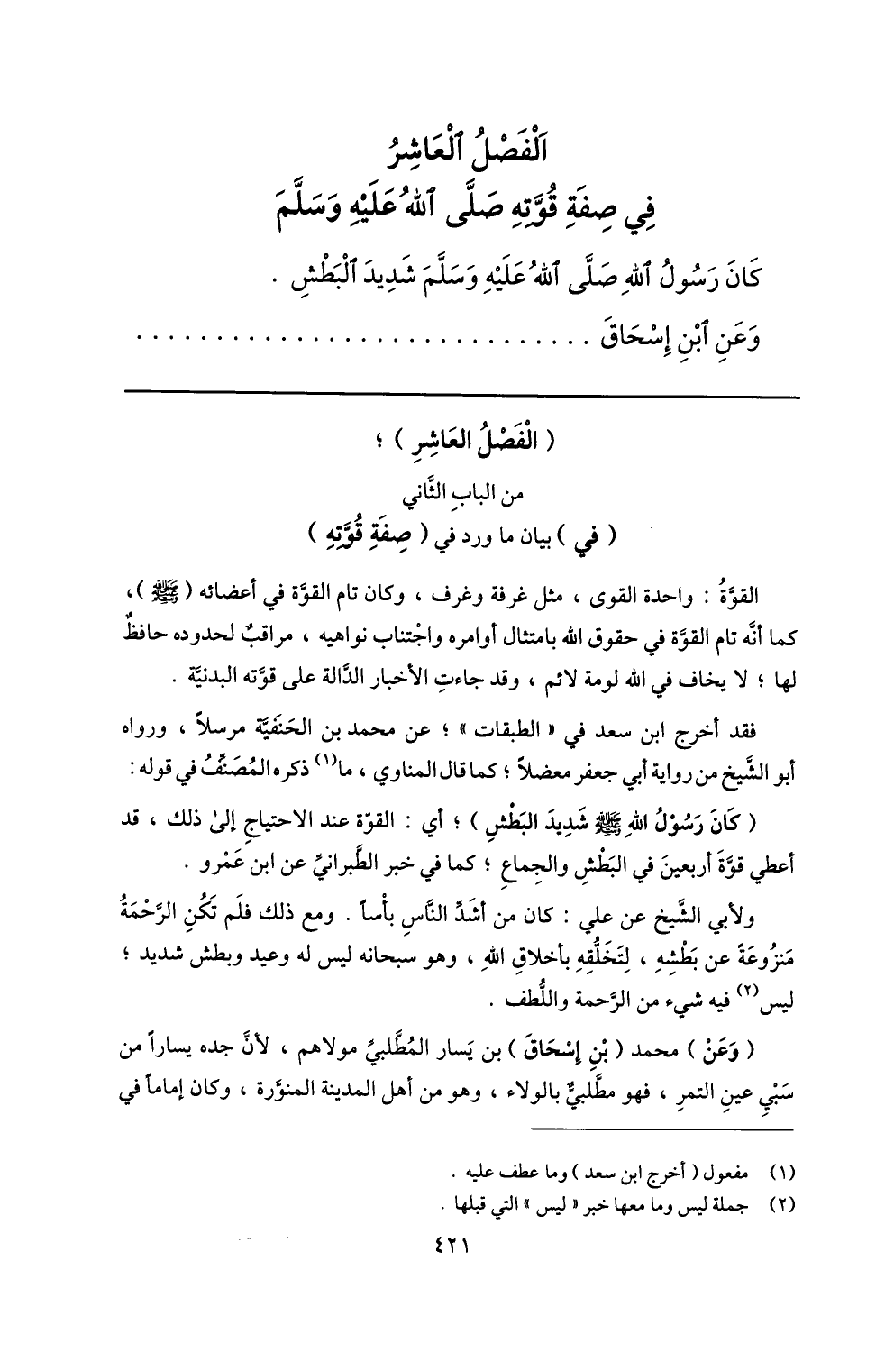 (الفصل العاشر) ؛ من الباب الثّاني (في) بيان ما ورد في (صفة قوّته) القوّة: واحدة القوى، مثل غرفة وغرف، وكان تام القوّة في أعضائه (صلّى الله عليه وسلم) ، كما أنّه تام القوّة في حقوق الله بامتثال أوامره واجتناب نواهيه، مراقب لحدوده حافظ لها؛ لا يخاف في الله لومة لائم، وقد جاءت الأخبار الدّالة على قوّته البدنيّة.