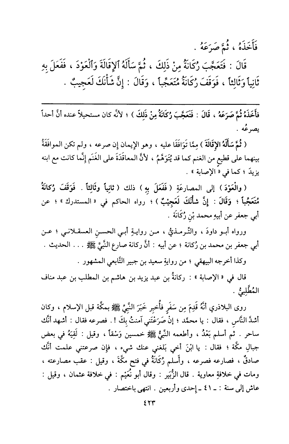 قال: فتعجّب ركانة من ذلك، ثمّ سأله الإقالة والعود، ففعل به ثانيا وثالثا، فوقف ركانة متعجّبا، وقال: إنّ شأنك لعجيب.