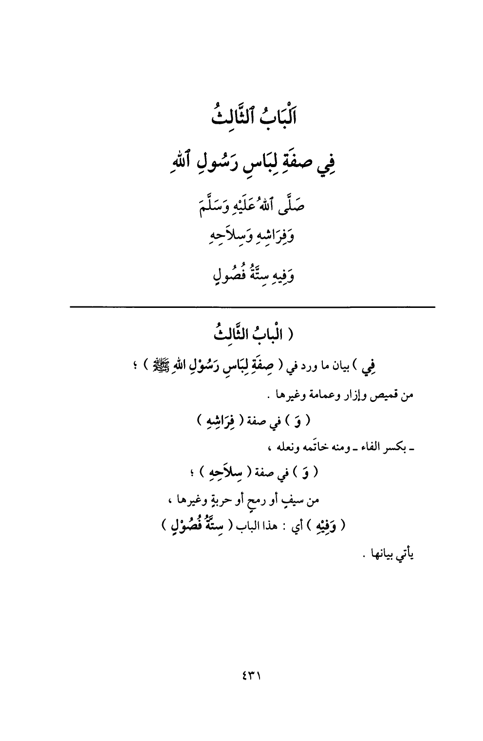 الباب الثّالث في صفة لباس رسول الله صلّى الله عليه وسلّم وفراشه وسلاحه وفيه ستّة فصول (الباب الثّالث في) بيان ما ورد في (صفة لباس رسول الله صلّى الله عليه وسلم) ؛ من قميص وإزار وعمامة وغيرها.
