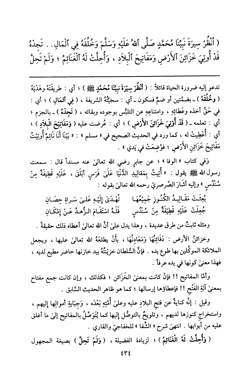 (انظر سيرة نبيّنا محمّد صلّى الله عليه وسلّم وخلقه في المال.. تجده قد أوتي خزائن الأرض ومفاتيح البلاد، وأحلّت له الغنائم؛ ولم تحلّ تدعو إليه ضرورة الحياة قائلا: (انظر سيرة نبيّنا محمّد صلّى الله عليه وسلم) ؛ أي: طريقته وهديه (وخلقه) - بضمّتين أو ضمّ فسكون- أي: سجيّته الشريفة، (في المال) ؛ أي: