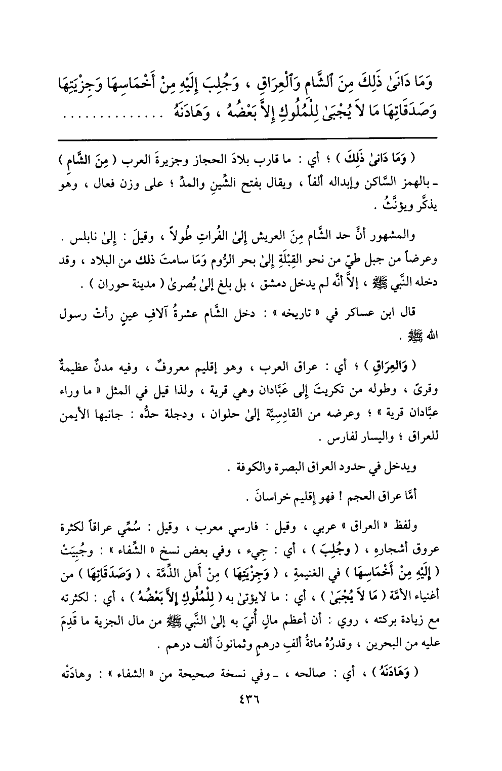 ولفظ «العراق» عربي، وقيل: فارسي معرب، وقيل: سمّي عراقا لكثرة عروق أشجاره، (وجلب) ، أي: جيء، وفي بعض نسخ «الشّفاء» : وجبيت (إليه من أخماسها) في الغنيمة، (وجزيتها) من أهل الذّمّة، (وصدقاتها) من أغنياء الأمّة (ما لا يجبى) ، أي: ما لا يؤتى به (للملوك إلّا بعضه) ، أي: لكثرته مع زيادة بركته، روي: أن أعظم مال أتي به إلى النّبي صلّى الله عليه وسلم من مال الجزية ما قدم عليه من البحرين، وقدره مائة ألف درهم وثمانون ألف درهم.