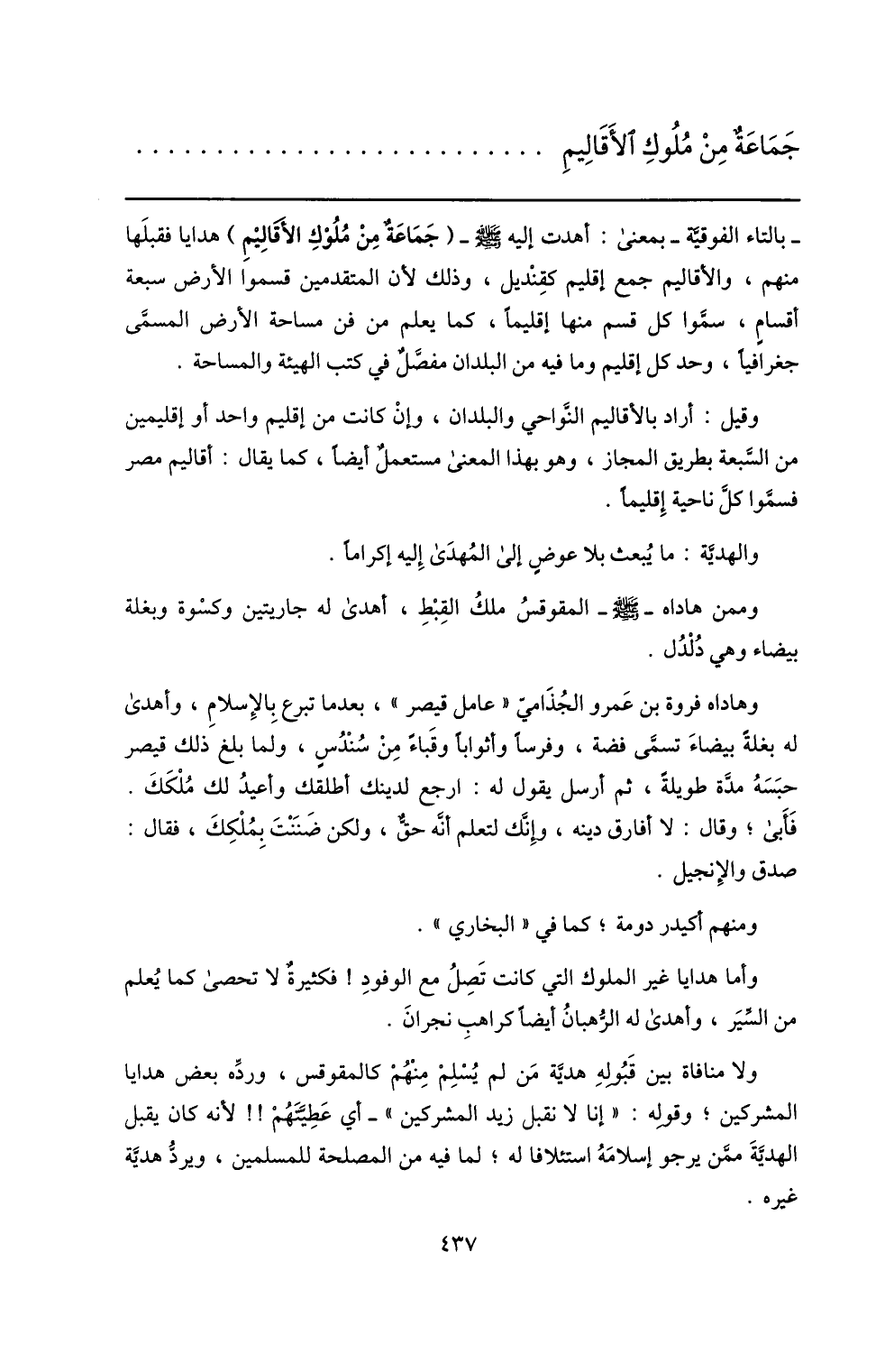 - بالتاء الفوقيّة- بمعنى: أهدت إليه صلّى الله عليه وسلم- (جماعة من ملوك الأقاليم) هدايا فقبلها منهم، والأقاليم جمع إقليم كقنديل، وذلك لأن المتقدمين قسموا الأرض سبعة أقسام، سمّوا كل قسم منها إقليما، كما يعلم من فن مساحة الأرض المسمّى جغرافيا، وحد كل إقليم وما فيه من البلدان مفصّل في كتب الهيئة والمساحة.