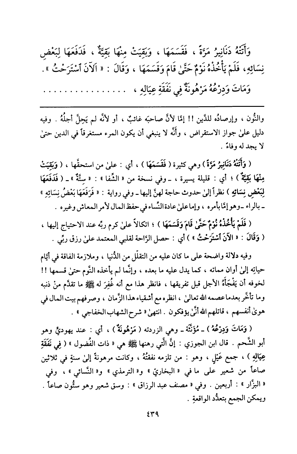 والنّون، وإرصاده للدّين!! إمّا لأنّ صاحبه غائب، أو لأنّه لم يحلّ أجله. وفيه دليل على جواز الاستقراض، وأنّه لا ينبغي أن يكون المرء مستغرقا في الدين حتى لا يجد له وفاء.