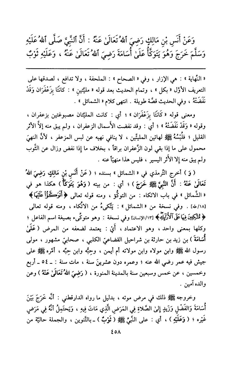 وعن أنس بن مالك رضي الله تعالى عنه: أنّ النّبيّ صلّى الله عليه وسلّم خرج وهو يتوكّأ على أسامة رضي الله تعالى عنه، وعليه ثوب «النّهاية» : هي الإزار، وفي «الصحاح» : الملحفة، ولا تدافع، لصدقها على التعريف الأوّل «بكل» ، وتمام الحديث بعد قوله «مليّتين» : كانتا بزعفران وقد نفضته، وفي الحديث قصّة طويلة. انتهى كلام «الشمائل» .