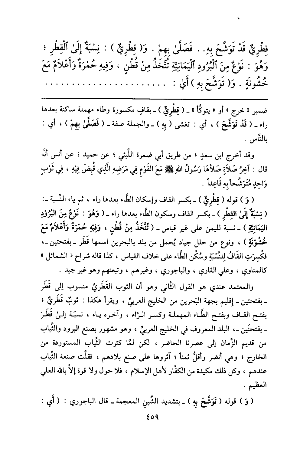 قطريّ قد توشّح به.. فصلّى بهم. و (قطريّ) : نسبة إلى القطر؛ وهو: نوع من البرود اليمانيّة تتّخذ من قطن، وفيه حمرة وأعلام مع خشونة. و (توشّح به) أي: ...