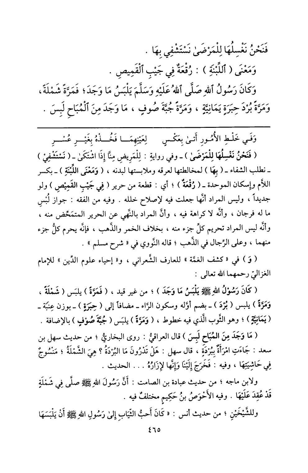 (ما وجد من المباح لبس) قال العراقيّ: روى البخاريّ؛ من حديث سهل بن سعد: جاءت امرأة ببردة، قال سهل: هل تدرون ما البردة؟ هي الشّملة؛ منسوج في حاشيتها، وفيه: فخرج إلينا وإنّها لإزاره ... الحديث.