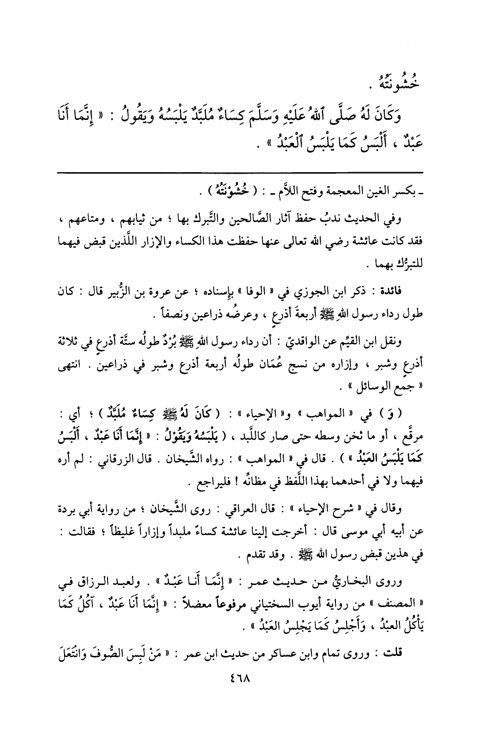 مرقّع، أو ما ثخن وسطه حتى صار كاللّبد، (يلبسه ويقول: «إنّما أنا عبد، ألبس كما يلبس العبد» ) . قال في «المواهب» : رواه الشّيخان. قال الزرقاني: لم أره فيهما ولا في أحدهما بهذا اللّفظ في مظانّه! فليراجع.