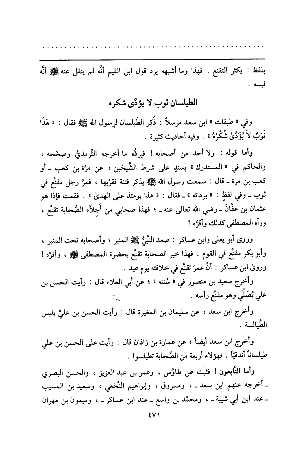 الطيلسان ثوب لا يؤدّى شكره وفي «طبقات» ابن سعد مرسلا: ذكر الطّيلسان لرسول الله صلّى الله عليه وسلم فقال: «هذا ثوب لا يؤدّى شكره» . وفيه أحاديث كثيرة.