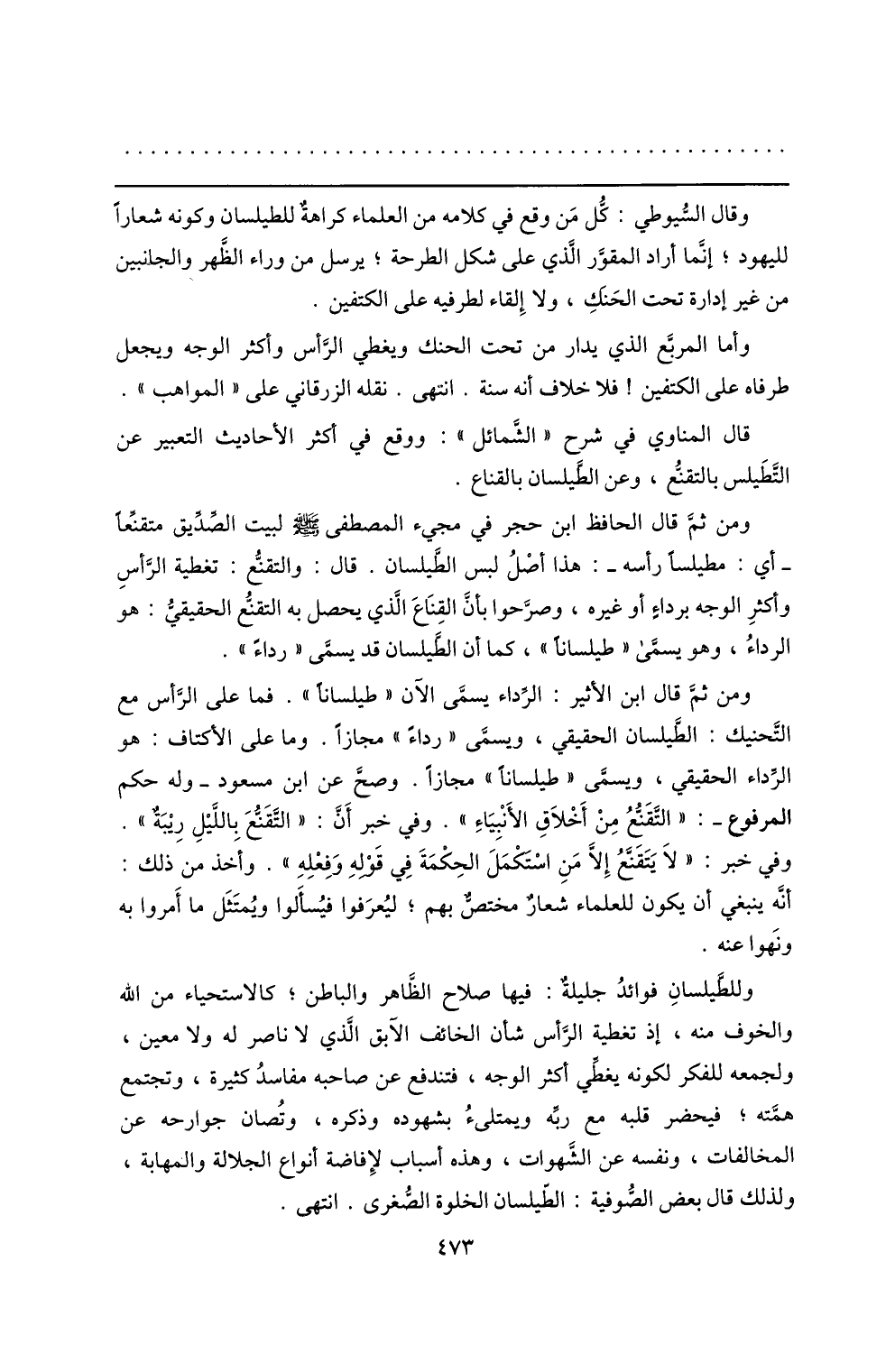 ومن ثمّ قال ابن الأثير: الرّداء يسمّى الآن «طيلسانا» . فما على الرّأس مع التّحنيك: الطّيلسان الحقيقي، ويسمّى «رداء» مجازا. وما على الأكتاف: هو الرّداء الحقيقي، ويسمّى «طيلسانا» مجازا. وصحّ عن ابن مسعود- وله حكم المرفوع-: «التّقنّع من أخلاق الأنبياء» . وفي خبر أنّ: «التّقنّع باللّيل ريبة» .