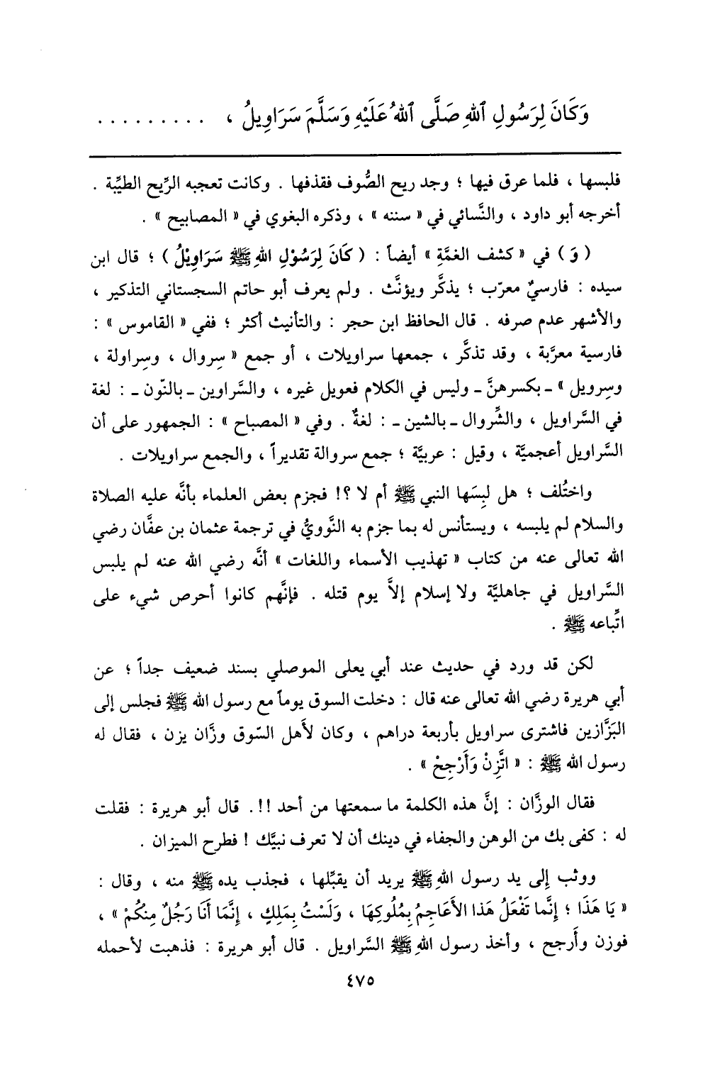«يا هذا؛ إنّما تفعل هذا الأعاجم بملوكها، ولست بملك، إنّما أنا رجل منكم» ، فوزن وأرجح، وأخذ رسول الله صلّى الله عليه وسلم السّراويل. قال أبو هريرة: فذهبت لأحمله
