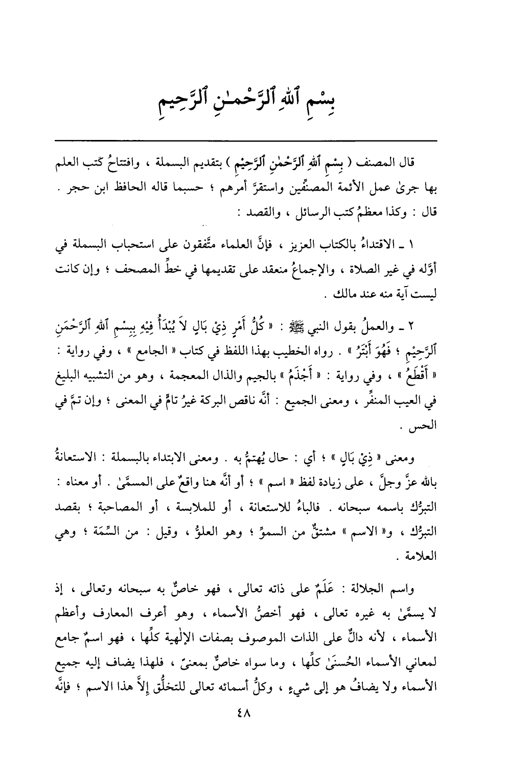 قال المصنف (بسم الله الرّحمن الرّحيم) بتقديم البسملة، وافتتاح كتب العلم بها جرى عمل الأئمة المصنّفين واستقرّ أمرهم؛ حسبما قاله الحافظ ابن حجر.