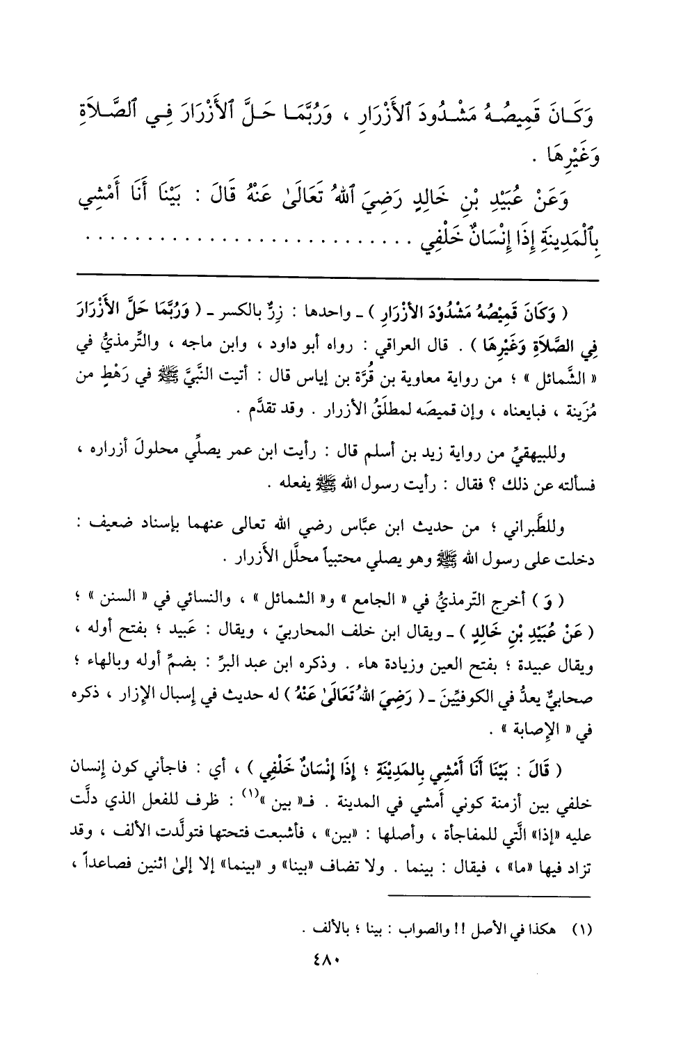 (قال: بينا أنا أمشي بالمدينة؛ إذا إنسان خلفي) ، أي: فاجأني كون إنسان خلفي بين أزمنة كوني أمشي في المدينة. ف «بين» «1» : ظرف للفعل الذي دلّت عليه «إذا» الّتي للمفاجأة، وأصلها: «بين» ، فأشبعت فتحتها فتولّدت الألف، وقد تزاد فيها «ما» ، فيقال: بينما. ولا تضاف «بينا» و «بينما» إلا إلى اثنين فصاعدا،