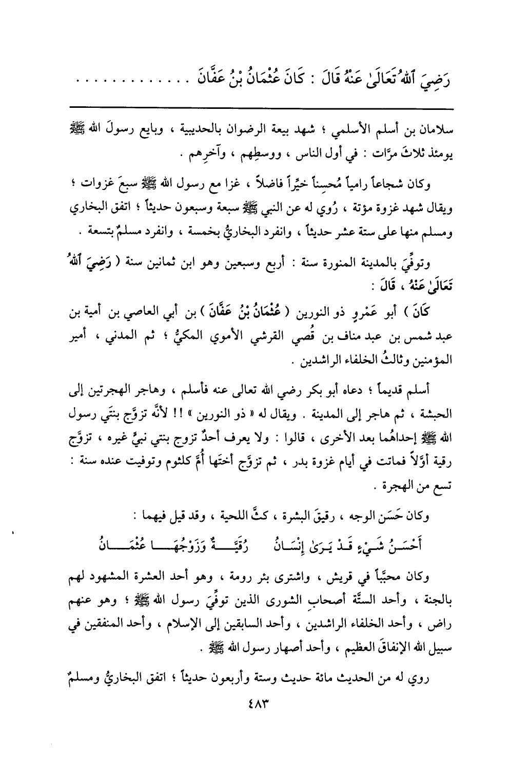 أسلم قديما؛ دعاه أبو بكر رضي الله تعالى عنه فأسلم، وهاجر الهجرتين إلى الحبشة، ثم هاجر إلى المدينة. ويقال له «ذو النورين» !! لأنّه تزوّج بنتي رسول الله صلّى الله عليه وسلم إحداهما بعد الأخرى، قالوا: ولا يعرف أحد تزوج بنتي نبيّ غيره، تزوّج رقية أوّلا فماتت في أيام غزوة بدر، ثم تزوّج أختها أمّ كلثوم وتوفيت عنده سنة: