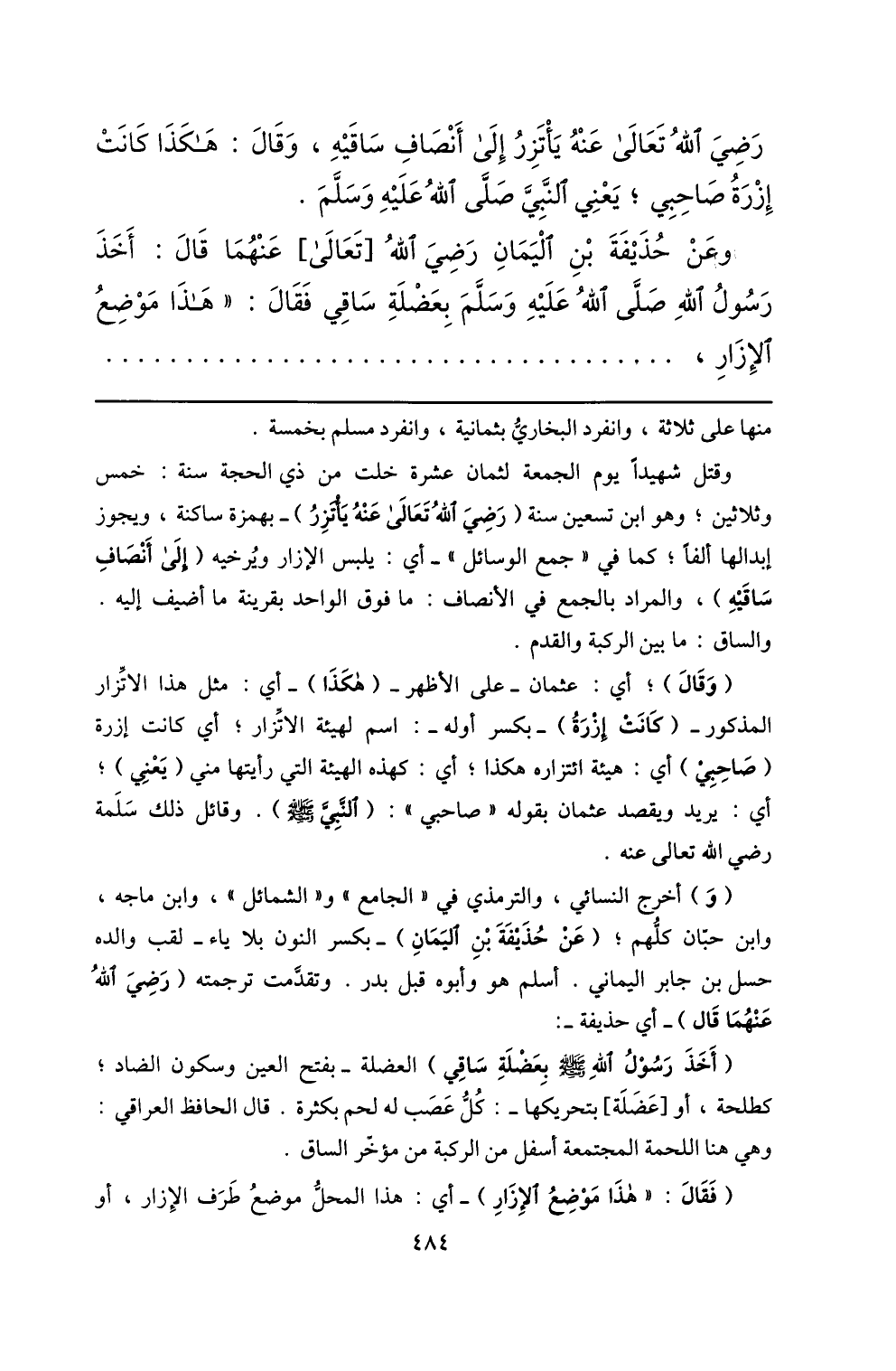 وعن حذيفة بن اليمان رضي الله [تعالى] عنهما قال: أخذ رسول الله صلّى الله عليه وسلّم بعضلة ساقي فقال: «هذا موضع الإزار، ...
