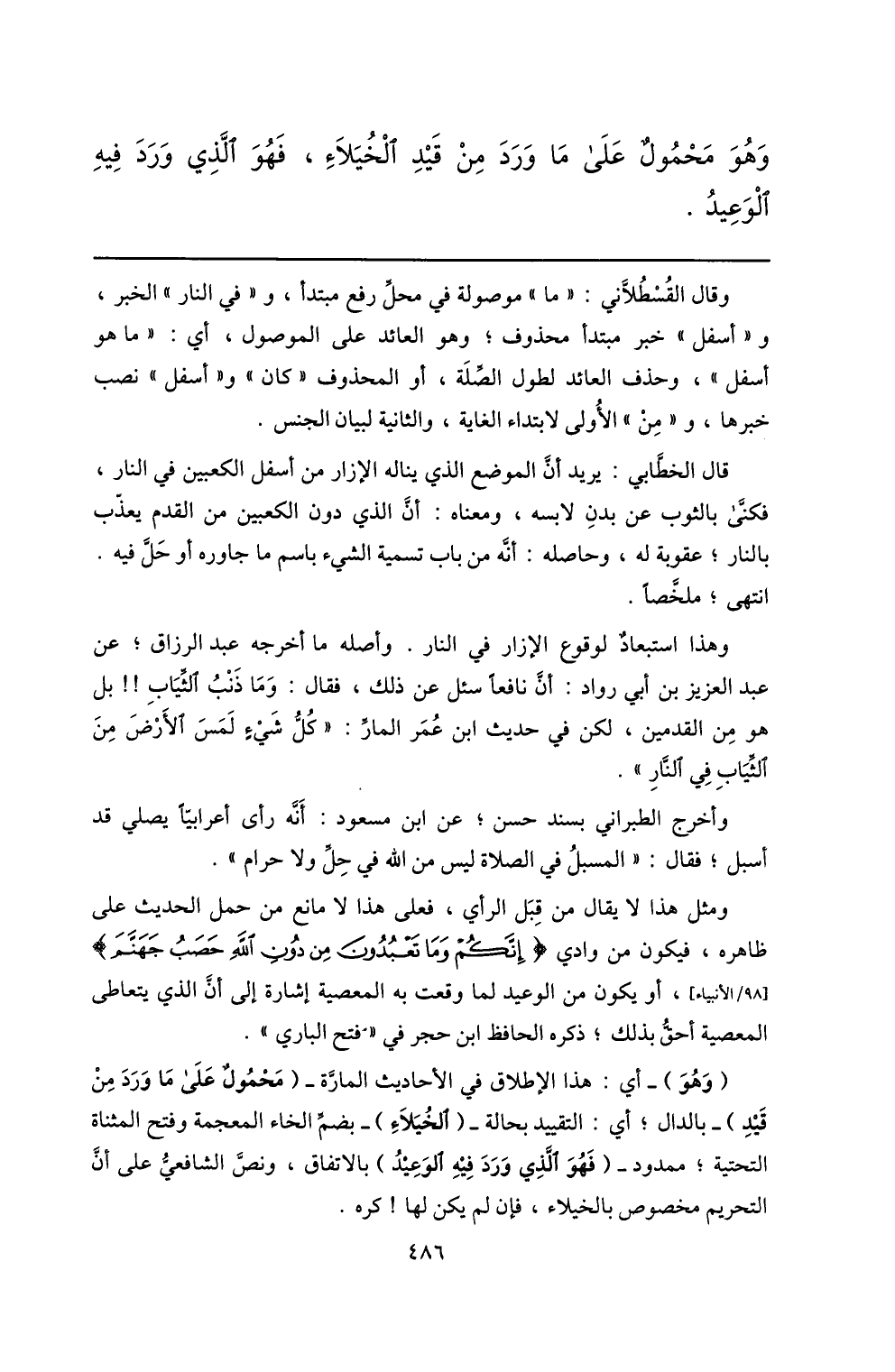 (وهو) - أي: هذا الإطلاق في الأحاديث المارّة- (محمول على ما ورد من قيد) - بالدال؛ أي: التقييد بحالة- (الخيلاء) - بضمّ الخاء المعجمة وفتح المثناة التحتية؛ ممدود- (فهو الّذي ورد فيه الوعيد) بالاتفاق، ونصّ الشافعيّ على أنّ التحريم مخصوص بالخيلاء، فإن لم يكن لها! كره.