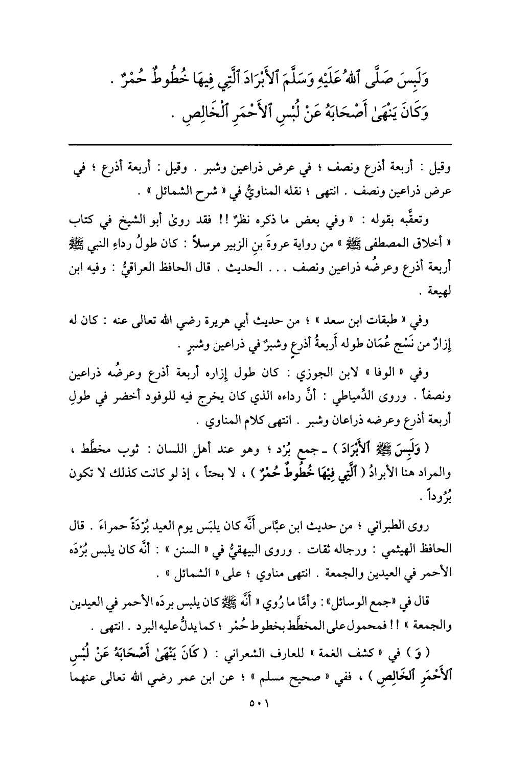 قال في «جمع الوسائل» : وأمّا ما روي «أنّه صلّى الله عليه وسلم كان يلبس برده الأحمر في العيدين والجمعة» !! فمحمول على المخطّط بخطوط حمر؛ كما يدلّ عليه البرد. انتهى.