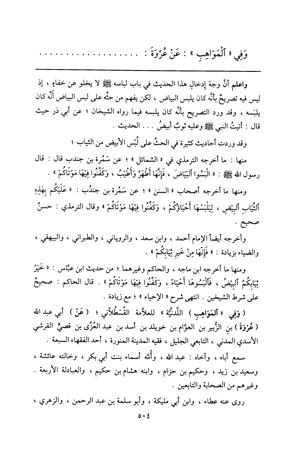 واعلم أنّ وجه إدخال هذا الحديث في باب لباسه صلّى الله عليه وسلم لا يخلو عن خفاء، إذ ليس فيه تصريح بأنّه كان يلبس البياض، لكن يفهم من حثّه على لبس البياض أنّه كان يلبسه، وقد ورد التصريح بأنّه كان يلبسه فيما رواه الشيخان؛ عن أبي ذر حيث قال: أتيت النبي صلّى الله عليه وسلم وعليه ثوب أبيض ... الحديث.