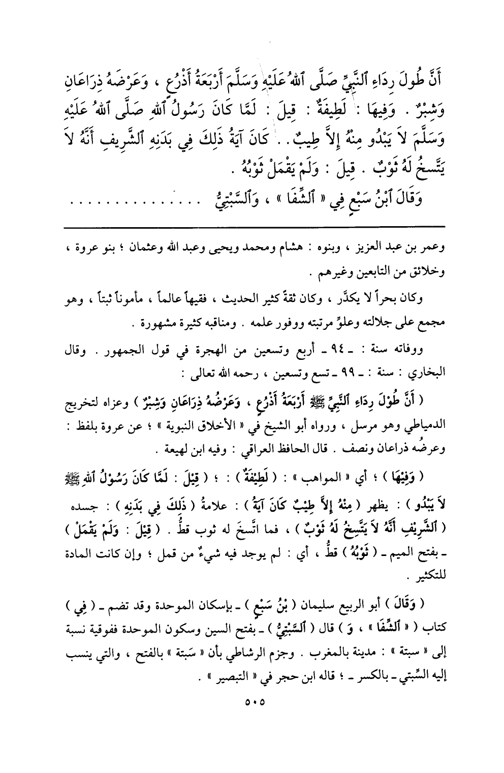 (أنّ طول رداء النّبيّ صلّى الله عليه وسلم أربعة أذرع، وعرضه ذراعان وشبر) وعزاه لتخريج الدمياطي وهو مرسل، ورواه أبو الشيخ في «الأخلاق النبوية» ؛ عن عروة بلفظ: