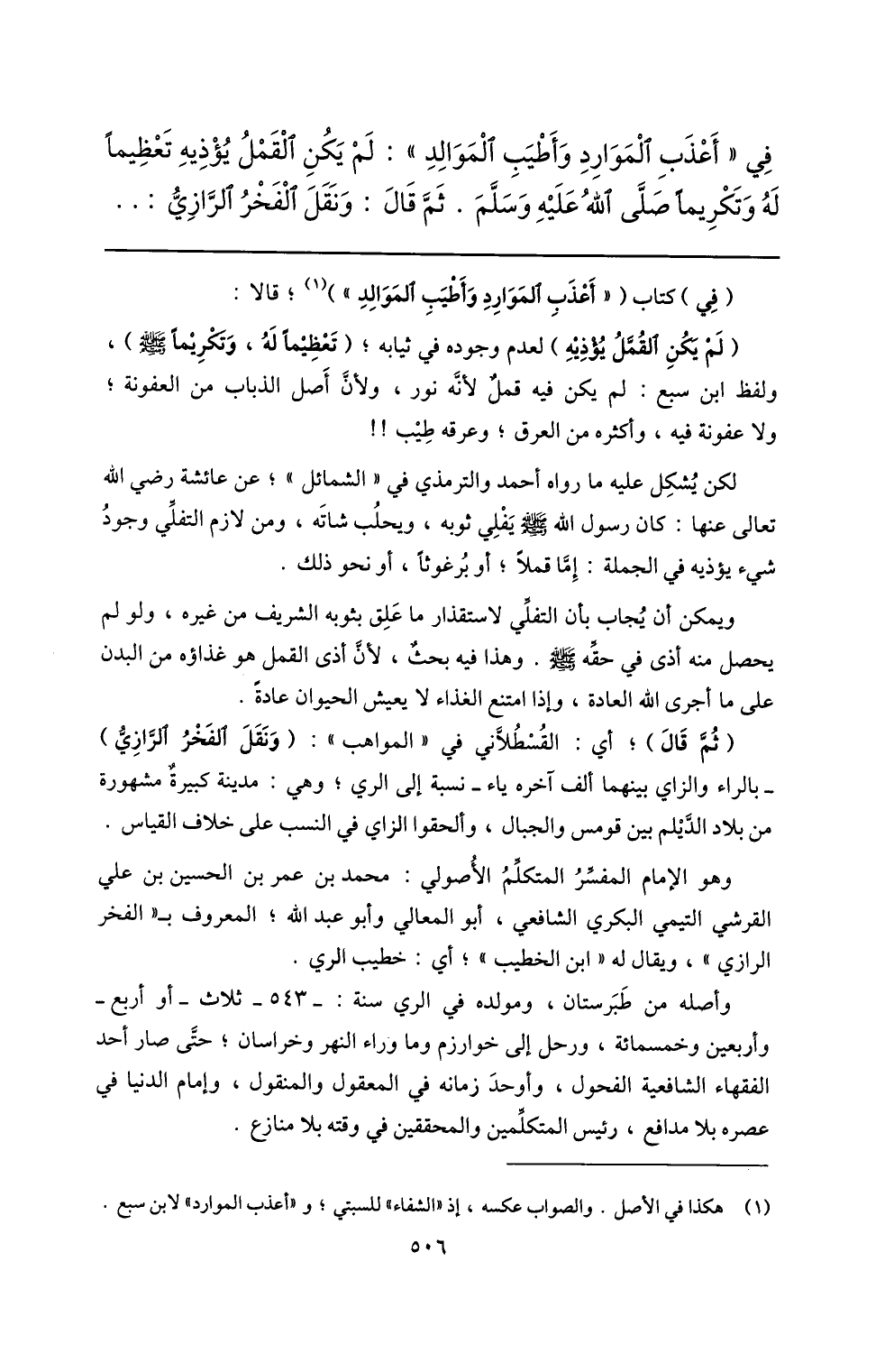 (ثمّ قال) ؛ أي: القسطلّاني في «المواهب» : (ونقل الفخر الرّازيّ) بالراء والزاي بينهما ألف آخره ياء- نسبة إلى الري؛ وهي: مدينة كبيرة مشهورة من بلاد الدّيلم بين قومس والجبال، وألحقوا الزاي في النسب على خلاف القياس.