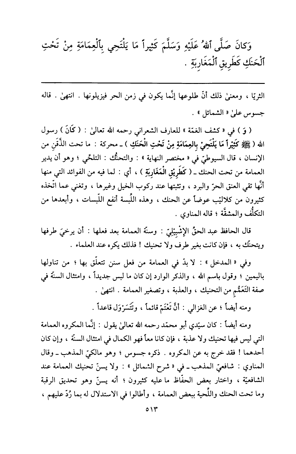 وكان صلّى الله عليه وسلّم كثيرا ما يلتحي بالعمامة من تحت الحنك كطريق المغاربة.