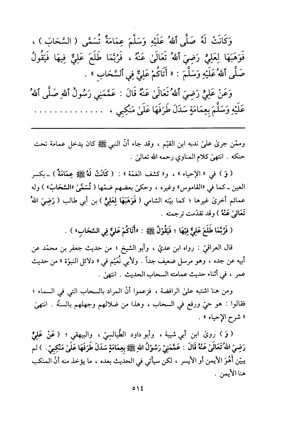 (و) في «الإحياء» ، و «كشف الغمّة» : (كانت له صلّى الله عليه وسلم عمامة) - بكسر العين- كما في «القاموس» وغيره، وحكى بعضهم ضمّها (تسمّى «السّحاب» ) وله عمائم أخرى غيرها؛ كما بيّنه الشامي (فوهبها لعليّ) بن أبي طالب (رضي الله تعالى عنه) وقد تقدّمت ترجمته.