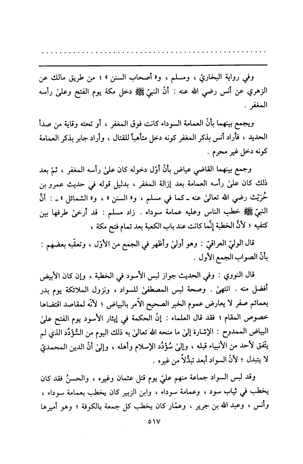 ويجمع بينهما بأنّ العمامة السوداء كانت فوق المغفر، أو تحته وقاية من صدأ الحديد، فأراد أنس بذكر المغفر كونه دخل متأهبا للقتال، وأراد جابر بذكر العمامة كونه دخل غير محرم.