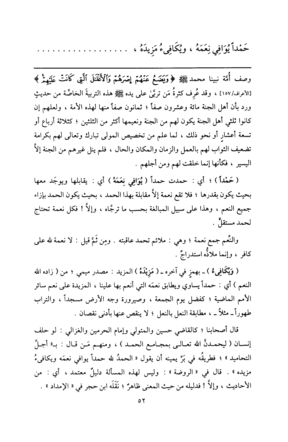 (ويكافىء) - بهمز في آخره- (مزيده) المزيد: مصدر ميمي؛ من (زاده الله النعم) أي: حمدا يساوي ويطابق نعمه التي أنعم بها علينا، المزيدة على نعم سائر الأمم الماضية؛ كفضل يوم الجمعة، وصيرورة وجه الأرض مسجدا، والتراب طهورا- مثلا-، مطابقة النعل بالنعل؛ لا ينقص عنها بأدنى نقصان.