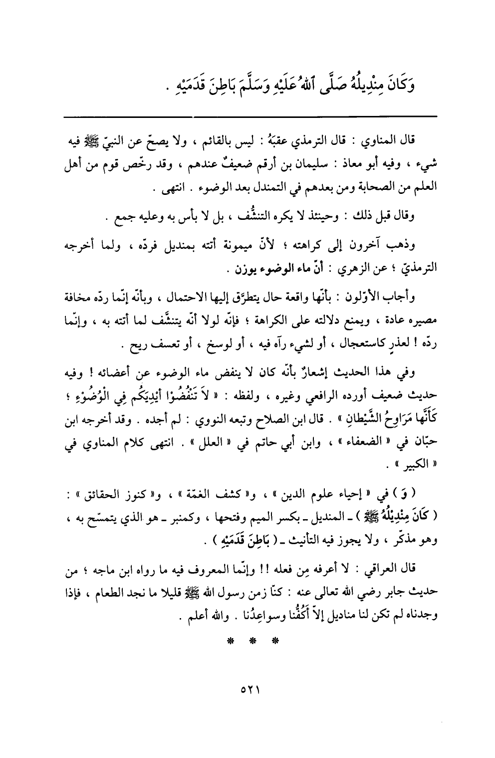 قال المناوي: قال الترمذي عقبه: ليس بالقائم، ولا يصحّ عن النبيّ صلّى الله عليه وسلم فيه شيء، وفيه أبو معاذ: سليمان بن أرقم ضعيف عندهم، وقد رخّص قوم من أهل العلم من الصحابة ومن بعدهم في التمندل بعد الوضوء. انتهى.