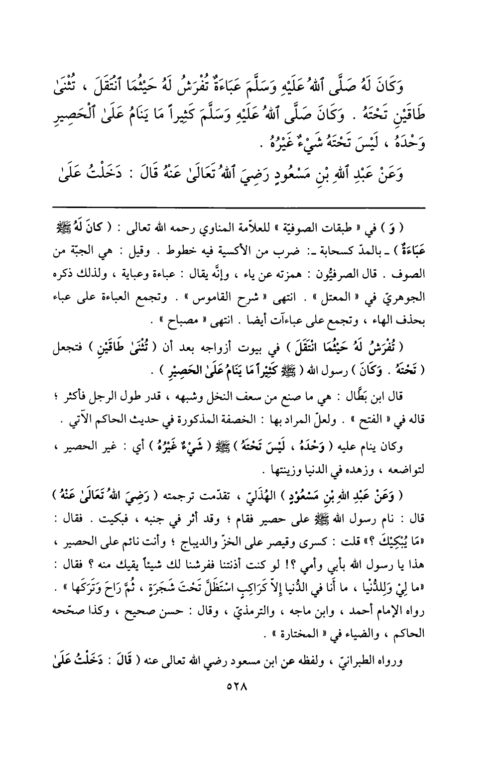 وعن عبد الله بن مسعود رضي الله تعالى عنه قال: دخلت على (و) في «طبقات الصوفيّة» للعلّامة المناوي رحمه الله تعالى: (كان له صلّى الله عليه وسلم عباءة) - بالمدّ كسحابة-: ضرب من الأكسية فيه خطوط. وقيل: هي الجبّة من الصوف. قال الصرفيّون: همزته عن ياء، وإنّه يقال: عباءة وعباية، ولذلك ذكره الجوهريّ في «المعتل» . انتهى «شرح القاموس» . وتجمع العباءة على عباء بحذف الهاء، وتجمع على عباءآت أيضا. انتهى «مصباح» .
