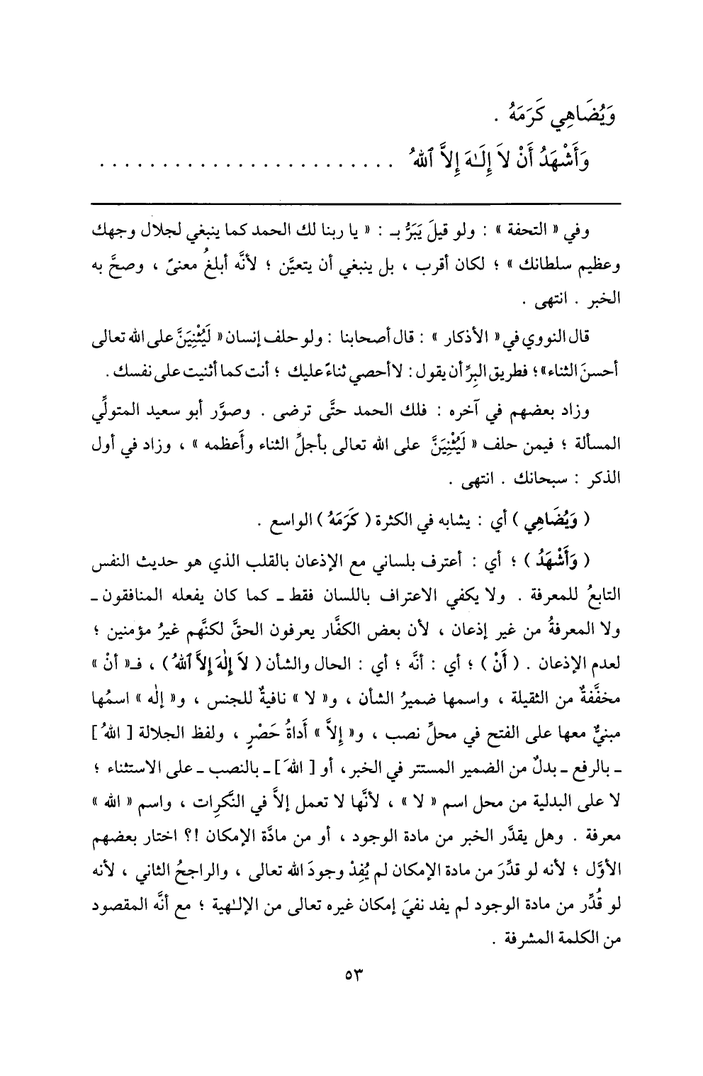 (وأشهد) ؛ أي: أعترف بلساني مع الإذعان بالقلب الذي هو حديث النفس التابع للمعرفة. ولا يكفي الاعتراف باللسان فقط- كما كان يفعله المنافقون- ولا المعرفة من غير إذعان، لأن بعض الكفّار يعرفون الحقّ لكنّهم غير مؤمنين؛ لعدم الإذعان. (أن) ؛ أي: أنّه؛ أي: الحال والشأن (لا إله إلّا الله) ، ف «أن» مخفّفة من الثقيلة، واسمها ضمير الشأن، و «لا» نافية للجنس، و «إله» اسمها مبنيّ معها على الفتح في محلّ نصب، و «إلّا» أداة حصر، ولفظ الجلالة [الله] بالرفع- بدل من الضمير المستتر في الخبر، أو [الله]- بالنصب- على الاستثناء؛ لا على البدلية من محل اسم «لا» ، لأنّها لا تعمل إلّا في النّكرات، واسم «الله» معرفة. وهل يقدّر الخبر من مادة الوجود، أو من مادّة الإمكان!؟ اختار بعضهم الأوّل؛ لأنه لو قدّر من مادة الإمكان لم يفد وجود الله تعالى، والراجح الثاني، لأنه لو قدّر من مادة الوجود لم يفد نفي إمكان غيره تعالى من الإلهية؛ مع أنّه المقصود من الكلمة المشرفة.