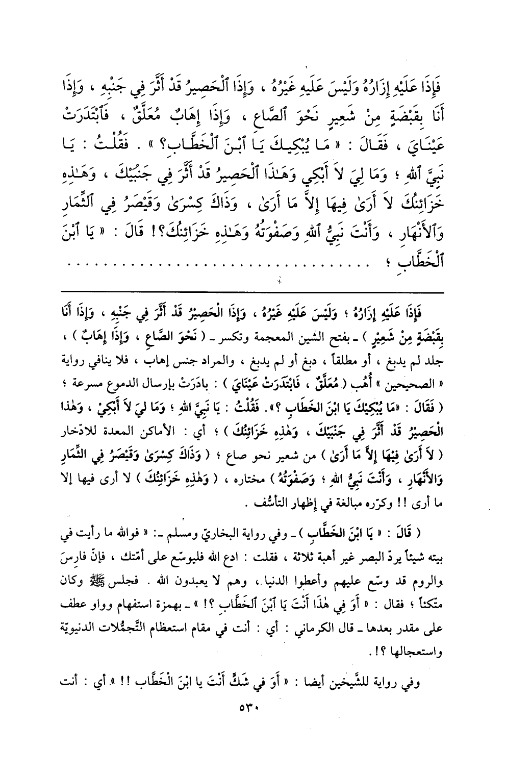 فإذا عليه إزاره وليس عليه غيره، وإذا الحصير قد أثّر في جنبه، وإذا أنا بقبضة من شعير نحو الصّاع، وإذا إهاب معلّق، فابتدرت عيناي، فقال: «ما يبكيك يا ابن الخطّاب؟» . فقلت: يا نبيّ الله؛ وما لي لا أبكي وهذا الحصير قد أثّر في جنبيك، وهذه خزائنك لا أرى فيها إلّا ما أرى، وذاك كسرى وقيصر في الثّمار والأنهار، وأنت نبيّ الله وصفوته وهذه خزائنك؟! قال: «يا ابن الخطّاب؛ ...
