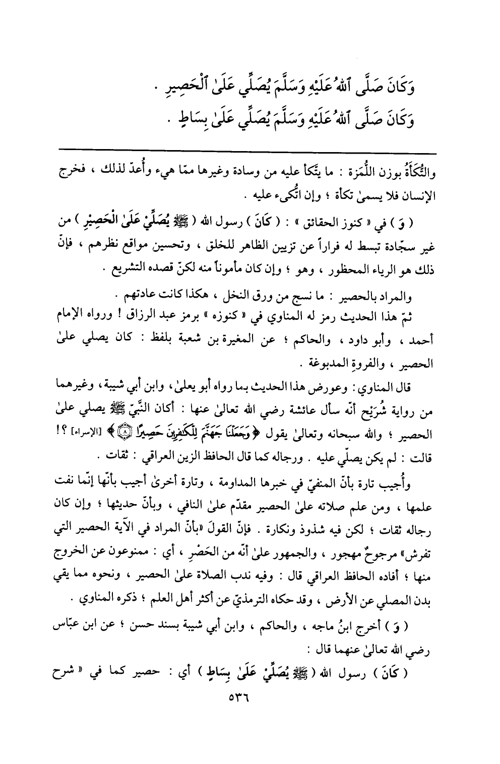 وأجيب تارة بأنّ المنفيّ في خبرها المداومة، وتارة أخرى أجيب بأنّها إنّما نفت علمها، ومن علم صلاته على الحصير مقدّم على النافي، وبأنّ حديثها؛ وإن كان رجاله ثقات؛ لكن فيه شذوذ ونكارة. فإنّ القول «بأنّ المراد في الآية الحصير التي تفرش» مرجوح مهجور، والجمهور على أنّه من الحصر، أي: ممنوعون عن الخروج منها؛ أفاده الحافظ العراقي قال: وفيه ندب الصلاة على الحصير، ونحوه مما يقي بدن المصلي عن الأرض، وقد حكاه الترمذيّ عن أكثر أهل العلم؛ ذكره المناوي.